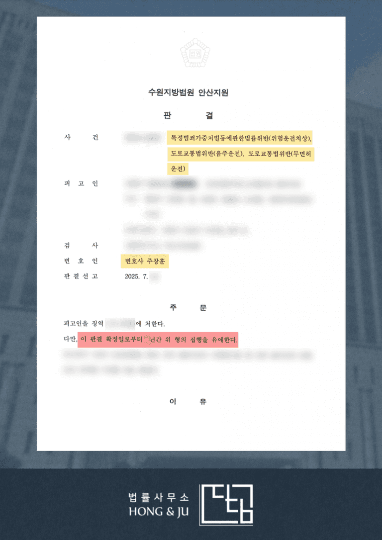 이로써 의뢰인의 무면허운전+음주운전 3진+위험운전치상 사건은 집행유예 선고로 법정 구속 대신 사회복귀의 기회를 얻은 것으로 종결됐습니다.