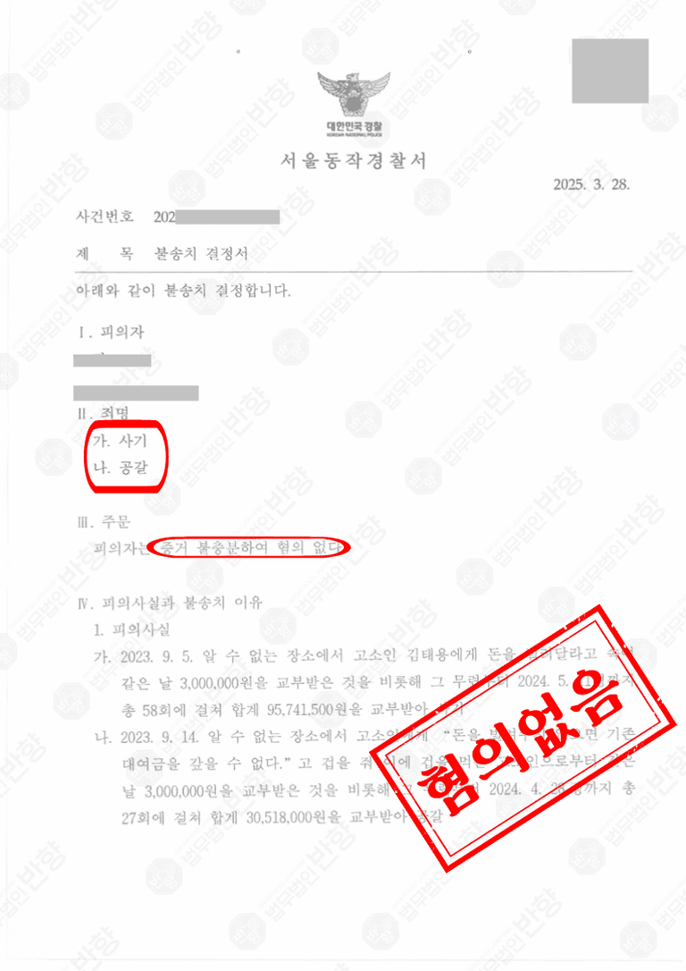 그 결과 수사기관은 사기 및 공갈 혐의 모두에 대하여 범죄를 인정할 만한 증거가 부족하다고 판단하여, 의뢰인 A씨에게 증거불충분을 이유로 한 혐의없음 처분을 내렸습니다. 이에 따라 A씨는 형사 책임을 지지 않고 사건을 종결할 수 있었습니다.