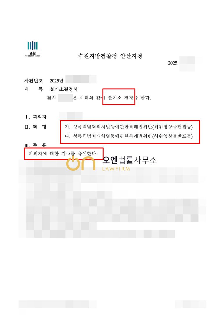 검찰은 오엔법률사무소의 주장을 받아들여, 아직 소년으로 초범인 점, 피해자와 합의를 하여 처벌을 원하지 않는 점, 의뢰인이 반성하고 재범방지를 위해 노력하고 있는 점 등의 양형 사유를 참작하여 성폭력범죄의처벌등에관한특례법위반(허위영상물편집, 반포등) 점에 대해 성폭력 재범방지 교육을 이수하는 것을 조건으로 기소를 유예하였습니다.