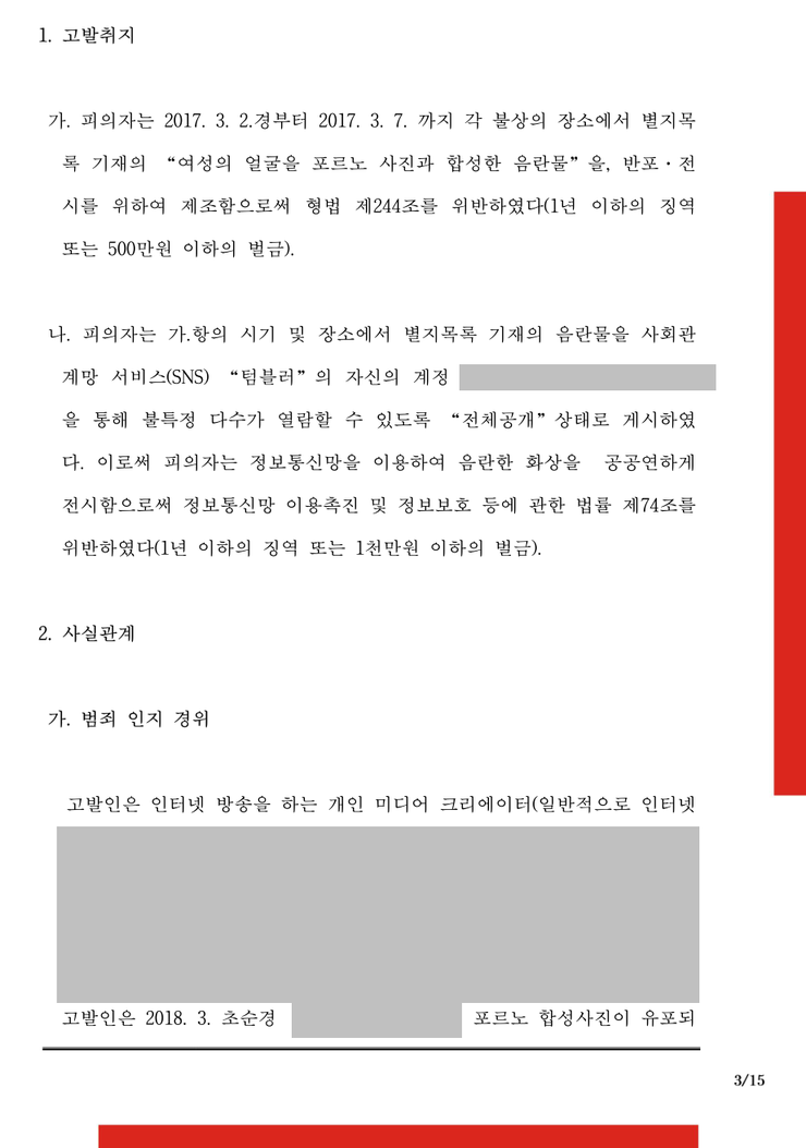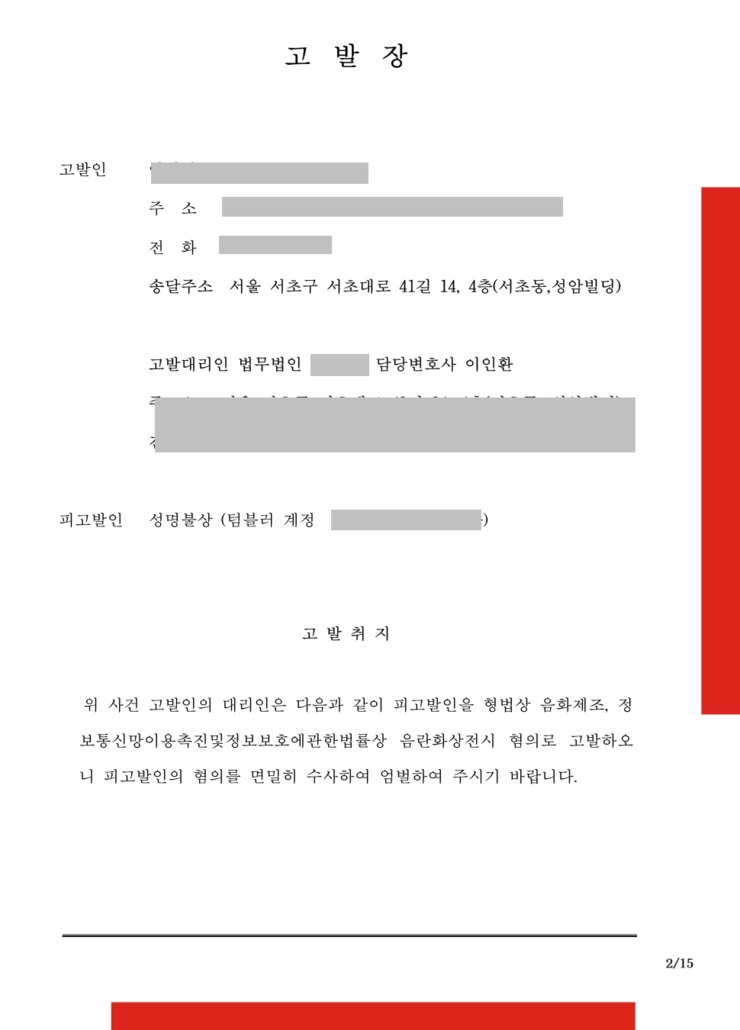 가. 사실관계 이른바 '지인합사'라는 이름으로, 지인을 음란한 사진에 합성하는 행위를 하는 자를 형사고소해달라는 의뢰. 피의자는 외국계 SNS인 "텀블러"를 이용하였기에 일반적인 기법으로는 피의자를 특정하는 것이 곤란한 상황 나. 해결 담당수사관서인 서울수서경찰서와의 공조를 통해 피의자 수사에 '특수한 절차'를 동원하여 피의자의 실제 인적사항을 추적하는데 성공했고, 피의자의 텀블러에 함께 있던 기타 수 많은 합성사진, 음란사진등을 일일이 확보하여 "음화제조 및 반포"행위로 공소가 제기, 피의자의 계좌등에 대한 압수수색을 통해 피의자가 음란물을 판매한 정황까지 확인하여 피의자를 엄한 벌에 처하도록 함.