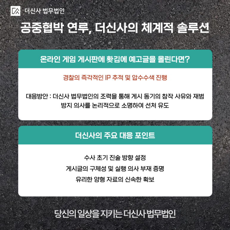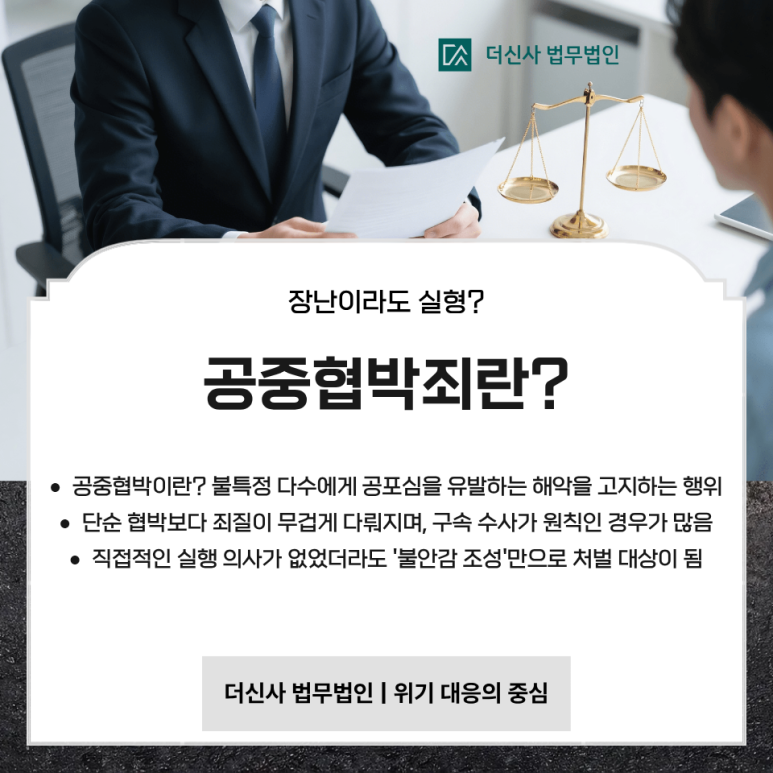공중협박죄는 단순한 장난으로 치부하기에는 법적 대가가 매우 큽니다. 만약 관련 혐의로 조사를 받게 된다면 사건 초기부터 전략적인 대응을 통해 처벌 수위를 낮추는 노력이 필수적입니다.