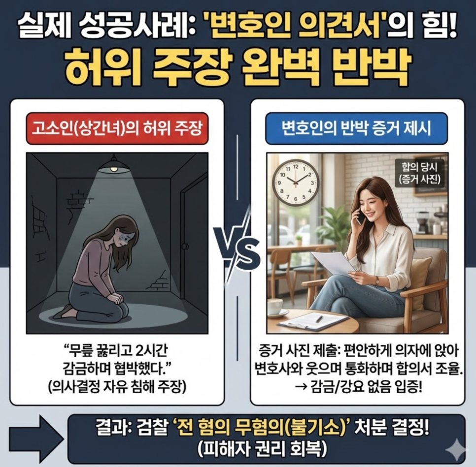 ▶고소인의 주장 : 고소인(상간자)은 의뢰인이 무릎을 꿇리고 2시간 동안 감금하며 합의서를 작성하지 않으면 직장과 자녀들의 학교에 불륜사실을 알리겠다고 협박하였고, 강압에 못이겨 합의서를 작성했다고 주장했습니다.