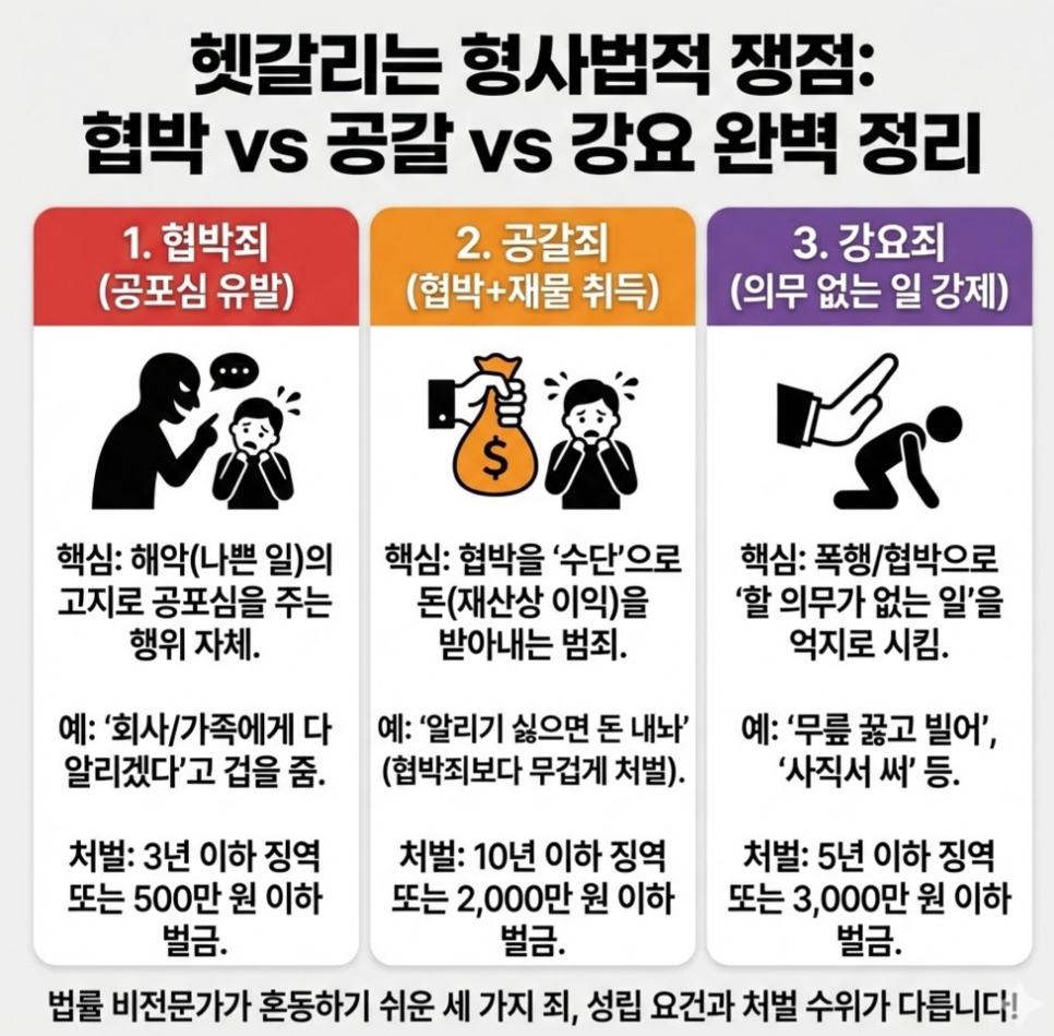 공갈, 협박, 강요는 얼핏 보기에 비슷해 보이지만 법적으로는 성립요건과 처벌 수위가 엄격히 구분됩니다.