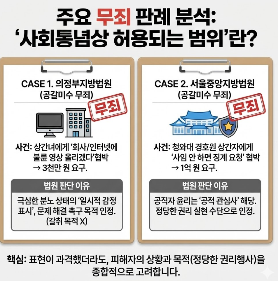 무죄 이유 : 법원은 피해자의 근무지에 징계와 사과를 요구하겠다는 등의 권리행사는 사회통념상 허용되는 정도를 벗어난 것으로 보이지 않는다고 판시하였습니다.