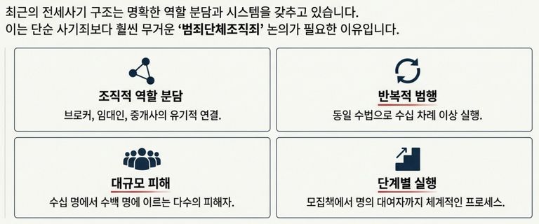 ✔ 「인천·수원 전세사기 조직」 사건 → 브로커·임대인·중개사 역할 분담이 명확해 범죄단체 인정 가능성이 높다는 평가