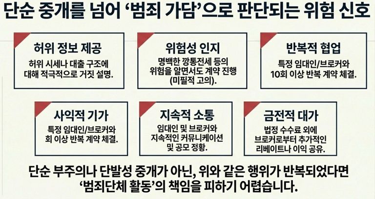 하지만 아래의 경우에는 중개인도 범죄단체 가입, 활동의 책임을 피하지 못할 수도 있습니다.