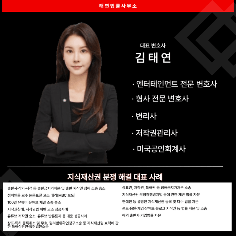 태연법률사무소의 김태연 대표 변호사 님께서는 유튜브 유행 전부터 유튜브 저작권 침해 신고, 유튜브 반론 통지, 유튜브 반론 통지 후 소장 접수 등 다양한 유튜브 분쟁 해결 사례를 누적하고 계신 '유튜브 분쟁 해결에 특화된 변호사'이십니다.