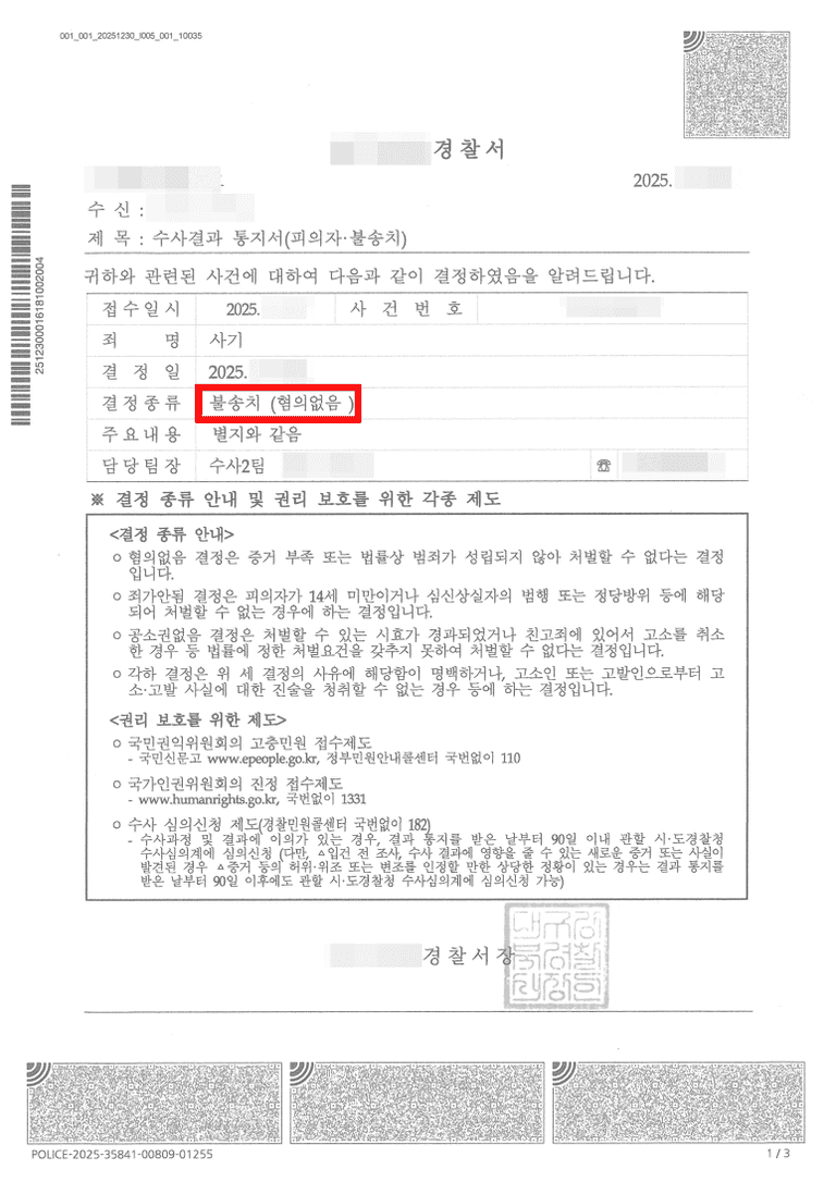 결국 검찰은 혐의없음 결론을 내렸고 사건은 불송치로 마무리되었습니다.
