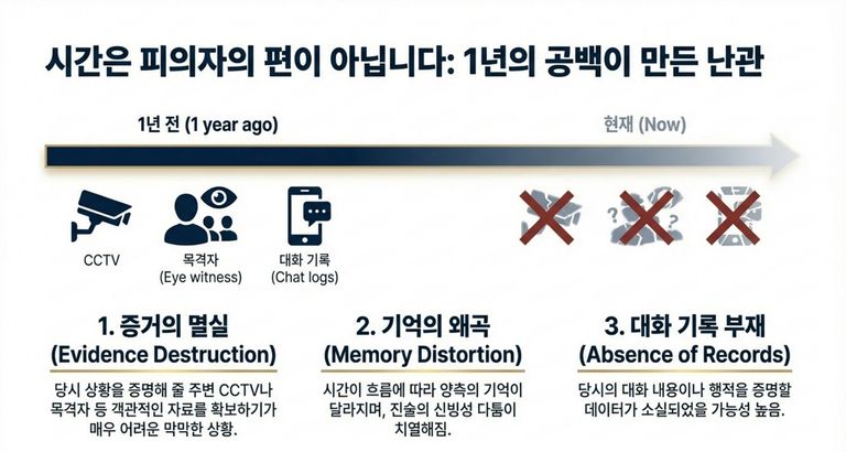 기억의 왜곡: 시간이 흐름에 따라 양측의 기억이 달라져 진술의 신빙성 싸움이 치열해집니다.