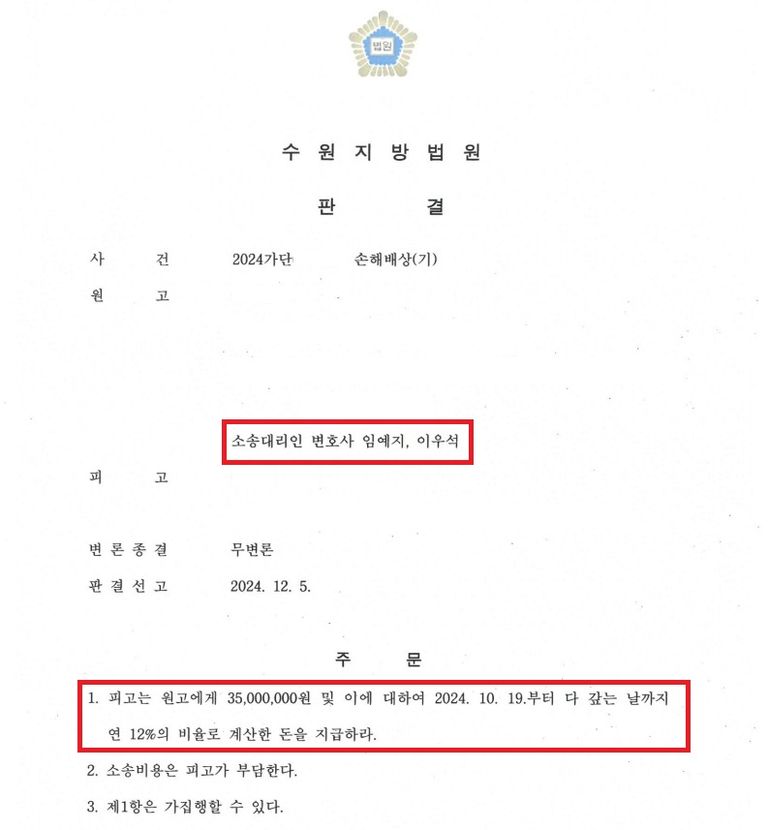 법률사무소 예우는 3,500만원 전액을 위자료로 인정받아 성공적으로 원고 전부 승소판결을 이끌어 냈습니다.
