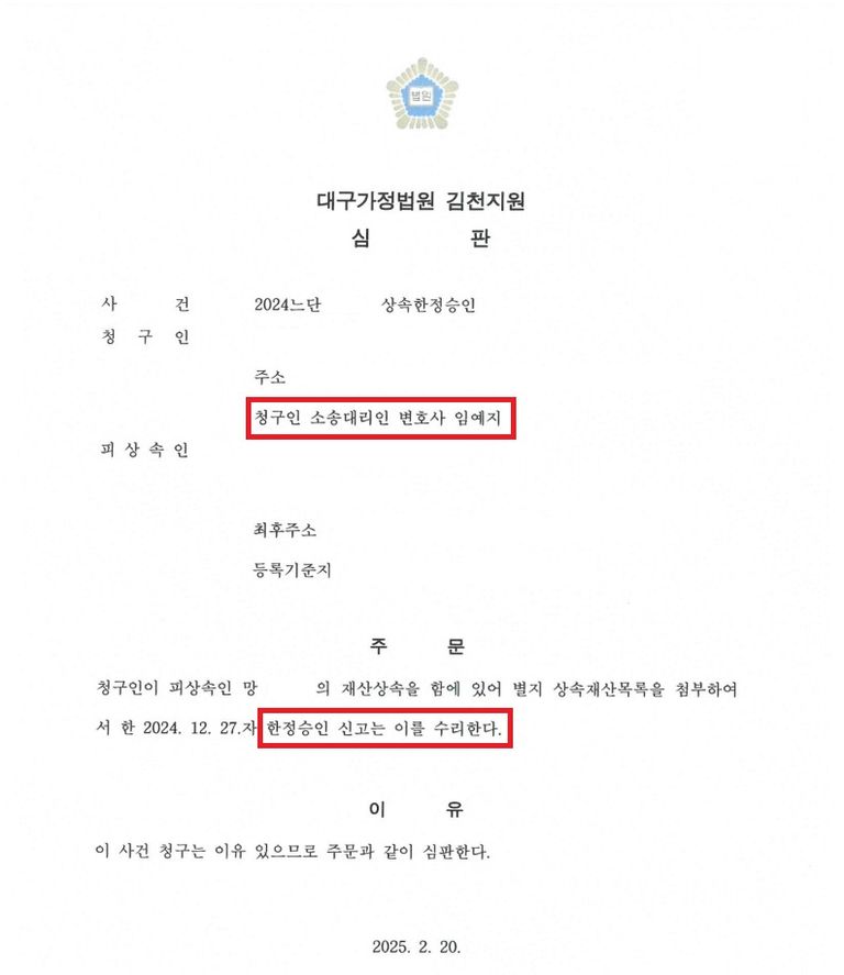 법률사무소 예우의 적극적인 조력으로 신고한지 약 2개월 만에 한정승인 수리 결정을 받을 수 있었으며, 의뢰인이 거액의 상속채무로부터 보호받을 수 있게 되었던 사례였습니다.