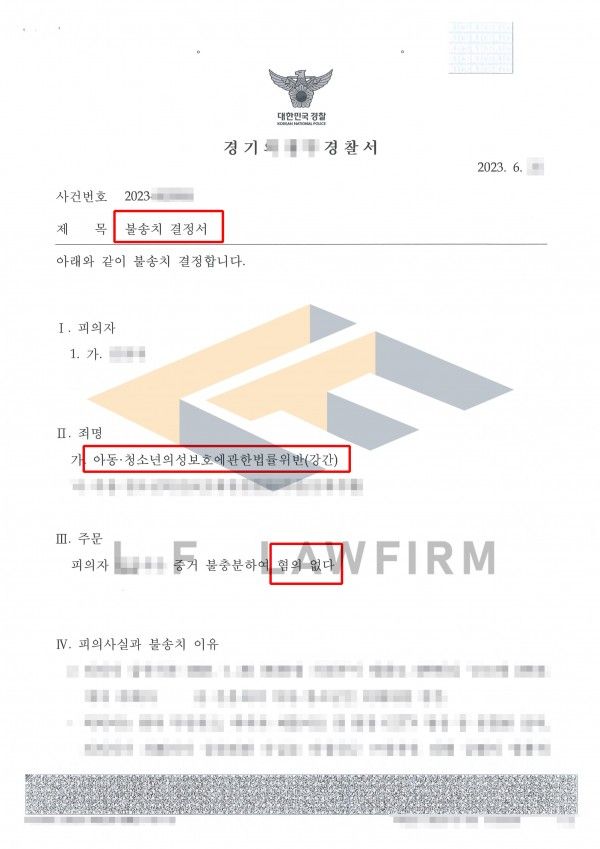 의뢰인은 경찰 단계에서 경찰 불송치 처분을 받으며, 미성년자 대상 성범죄, 아동ㆍ청소년에 대한 강간 사안에서 빠르게 벗어날 수 있었습니다.