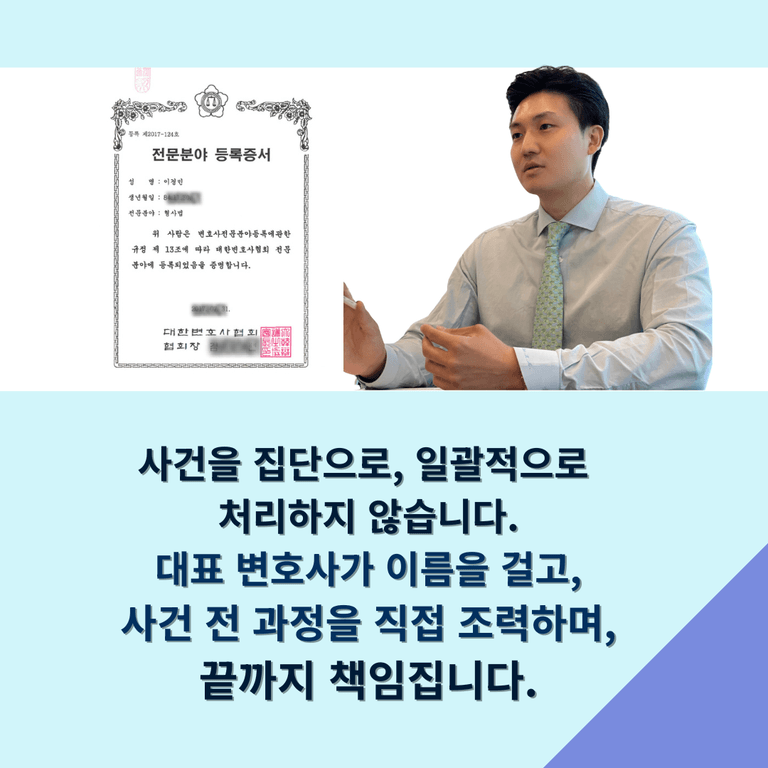 사건 도중 담당 변호인이 교체되는 사례가 종종 발생하는 만큼 처음부터 사건 해결에 능통한 베테랑 형사전문 법률대리인으로부터 도움받는 것이 보다 더 효과적이고 효율적인 방법이 될 수 있을 것입니다.