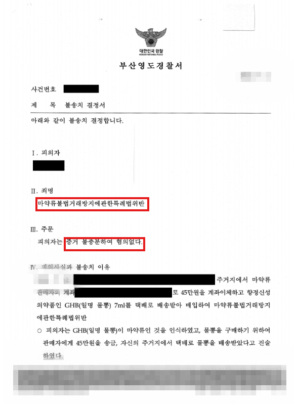 의뢰인 A씨는 인터넷 서핑 중 일명 '물뽕'이라 불리는 GHB에 대한 글을 접했습니다. 기분이 좋아진다는 말에 단순한 호기심이 발동했고, 결국 판매자에게 45만 원을 송금하고 택배로 GHB 7ml를 수령했습니다. GHB는 향정신성의약품(라목)으로 분류되어 소지하거나 매매할 경우 5년 이하의 징역에 처해지는 중범죄입니다.