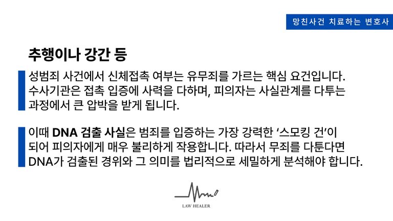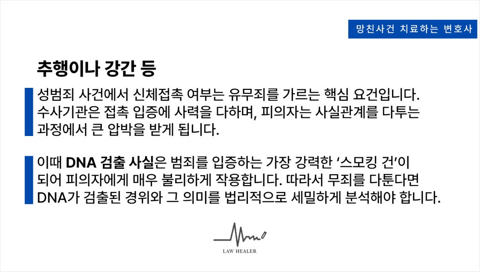 이 글에서는 신체접촉이 수반된 성범죄 사건에서 DNA 증거가 갖는 법적 의미와 그 한계를 찾아보고, DNA 증거가 존재함에도 무죄 판단에 이른 실제 수행사례(정우람 변호사 수행, 성공사례)들을 중심으로, 무죄를 다투는 입장에서 어떤 방식의 방어 논리가 요구되는지 살펴보고자 합니다.