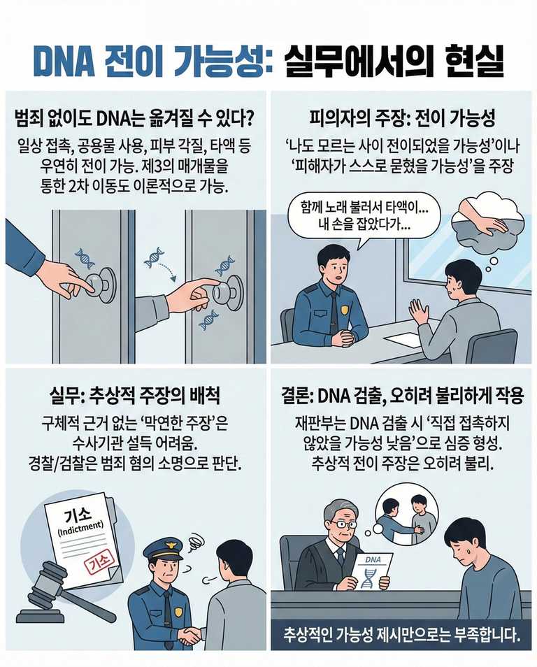 요컨대 DNA 검출은 신체 접촉의 존재를 시사할 수는 있지만, 그 접촉이 곧바로 범죄에 해당하는지는 별도의 증거와 정황을 통해 판단되어야 합니다.