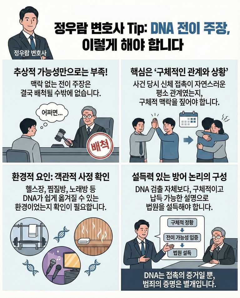 사건 당시 헬스장·찜질방·노래방과 같이 DNA가 쉽게 옮겨질 수 있는 환경이었는지 등 객관적 사정이 확인되어야 합니다.