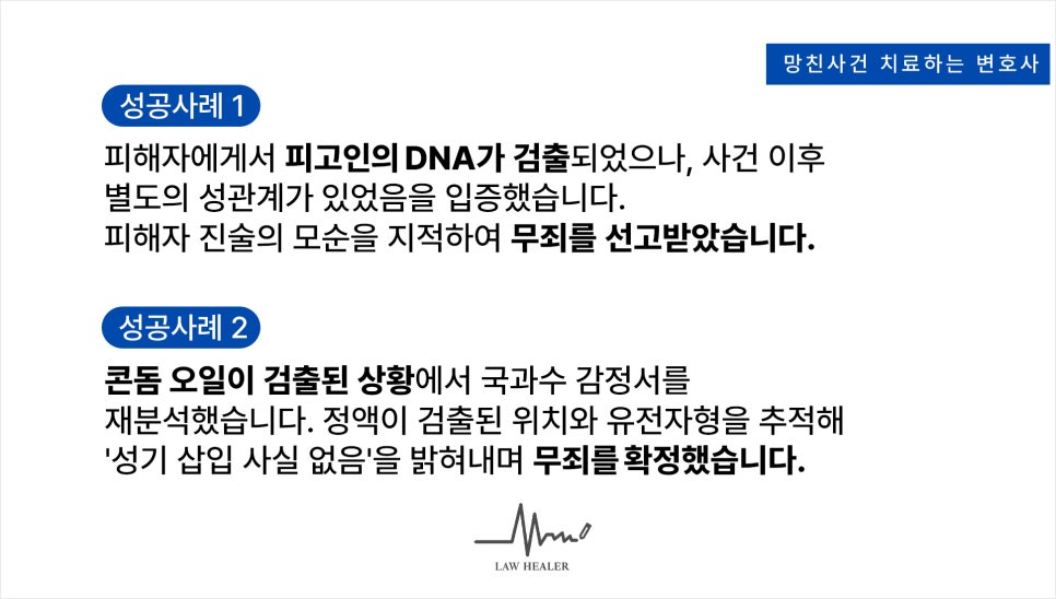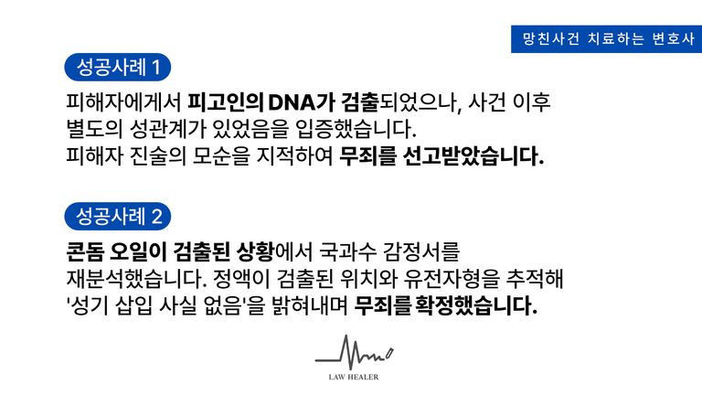 아래에서는 정우람 변호사가 직접 수행한 준강간 사건 가운데, DNA 증거의 한계를 짚어낸 두 가지 무죄 판결 사례를 살펴보겠습니다.