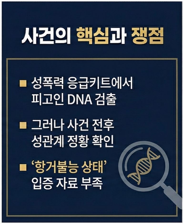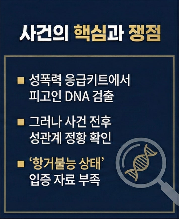나아가 DNA 증거가 항거불능 상태나 성기 삽입이라는 구성요건을 직접적으로 뒷받침하지 못한다는 점을 구체적으로 지적함으로써, DNA 검출 사실만으로는 범죄 혐의가 충분히 입증되지 않았음을 설득력 있게 강조하는 방어 논리가 필요함을 보여주는 사례입니다.