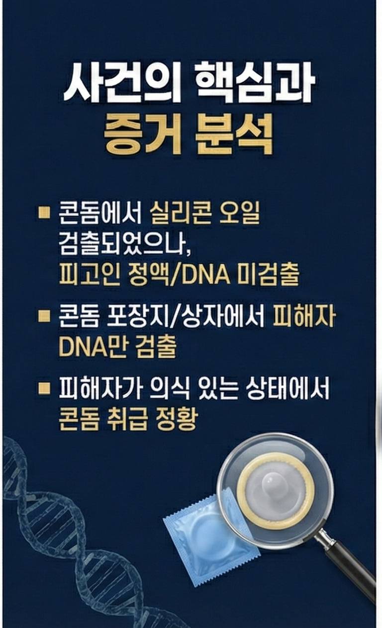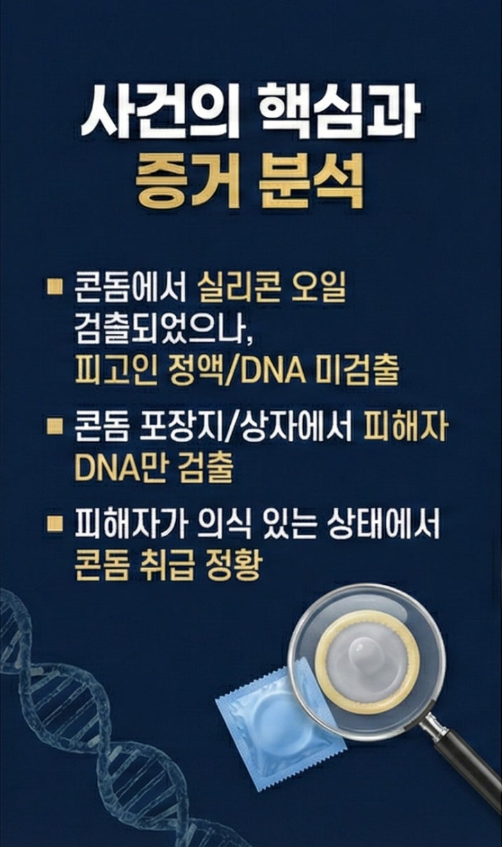 반면 콘돔의 껍질과 내부, 콘돔 상자 및 포장지에서는 피고인이 아닌 피해자의 DNA만 확인되었습니다. 이는 콘돔을 착용하지 않은 피고인의 성기가 피해자의 성기에 삽입되었다고 보기 어렵다는 점을 강하게 뒷받침하는 사정이었습니다.