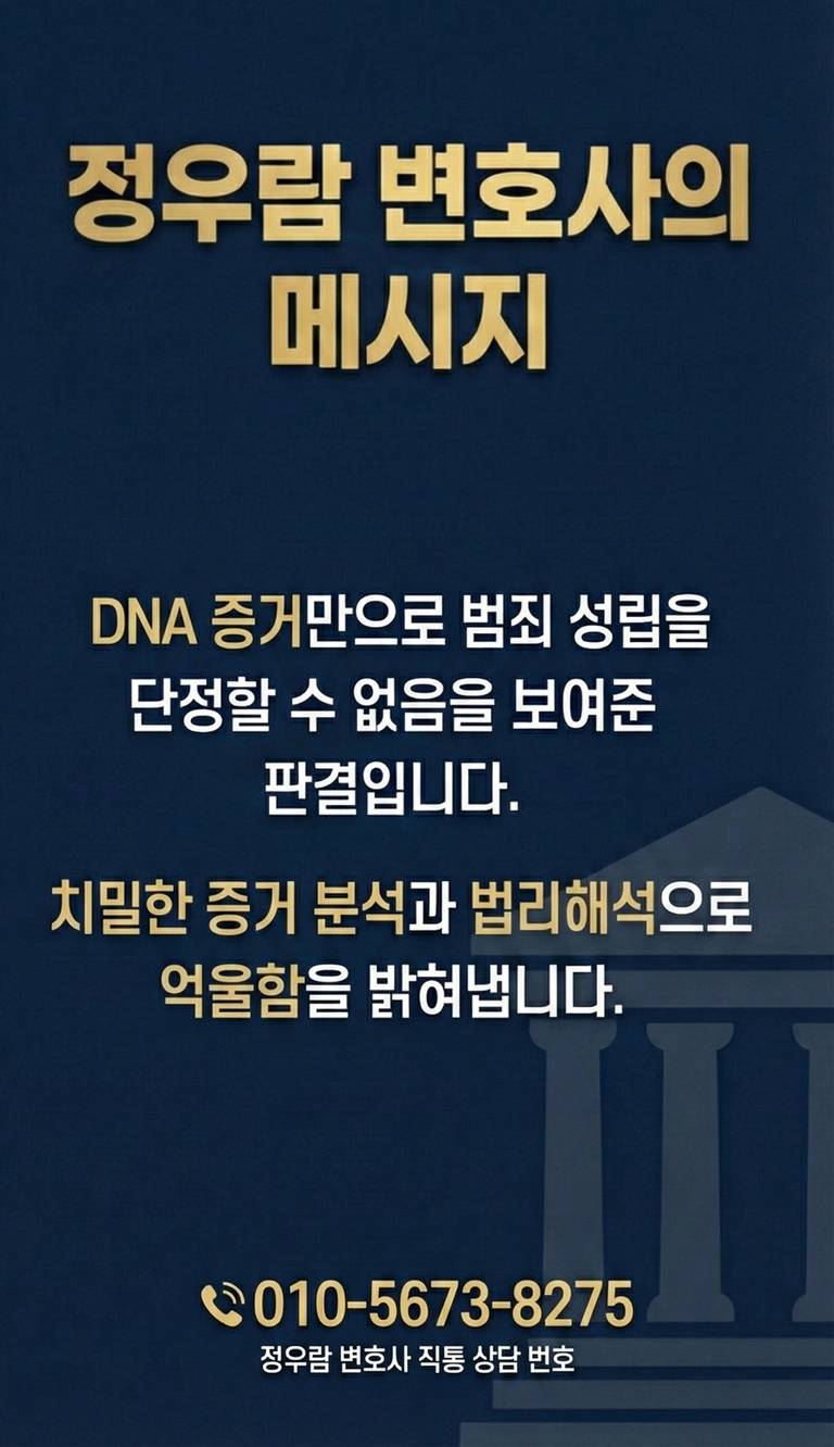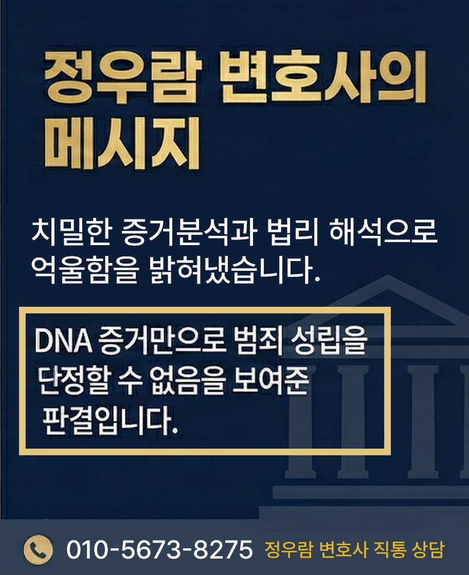 법원 역시 DNA만으로 범행이 입증되었다고 보기는 어렵다는 입장을 취하고 있으며, 방어 논리 역시 이러한 기준에 맞추어 구체적이고 납득 가능한 설명을 제시할 필요가 있습니다.