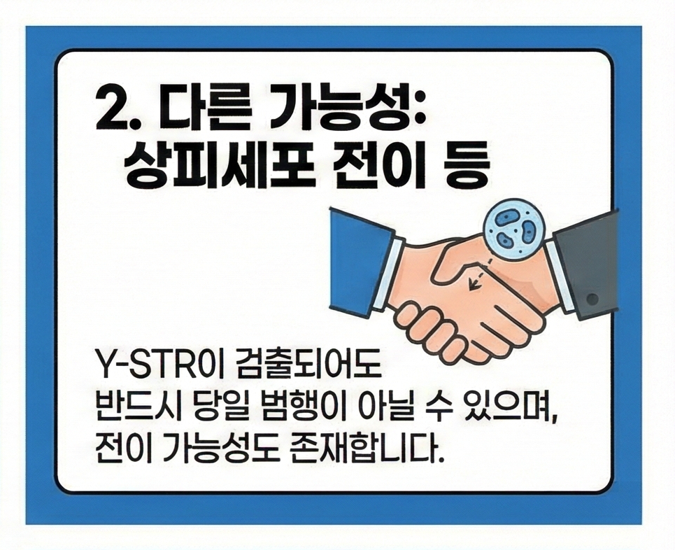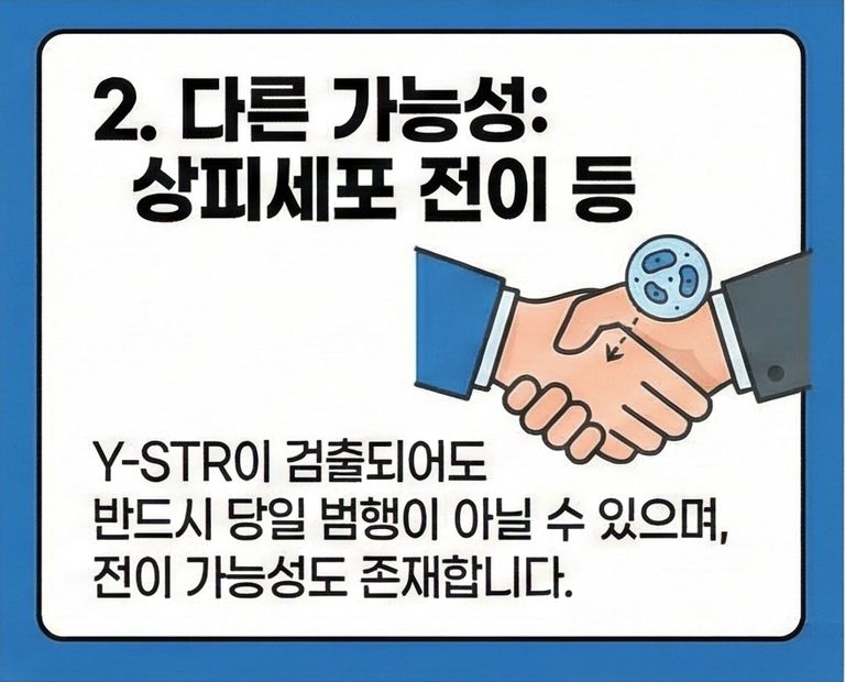 Y-STR 유전자형이 검출되더라도 반드시 당일의 범행으로 인한 것임을 단정할 수 없으며, 상피세포 전이 등 다른 경로로 인해 검출될 가능성 또한 충분히 존재하기 때문입니다.