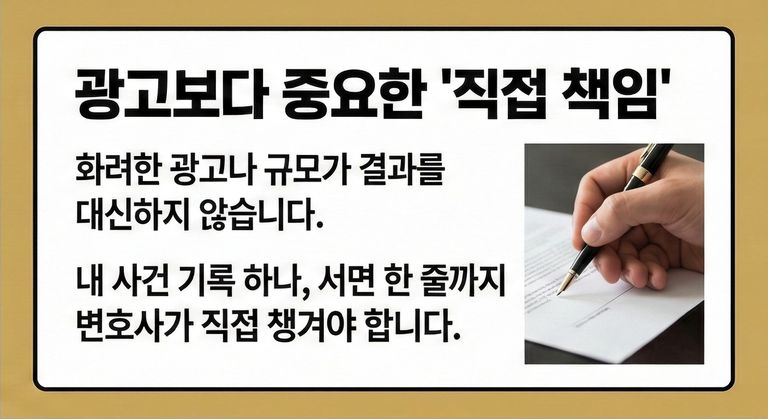 그래서 '광고를 잘하는 곳'이 아니라, 내 사건 기록 하나, 서면 한 줄까지 직접 책임지는 변호사의 조력이 필요합니다.