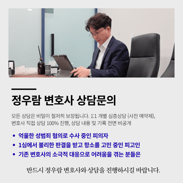 정우람 변호사는 성범죄 사건을 총괄 지휘하는 동시에 모든 서면을 직접 작성하고 협의와 변론을 주도합니다. 또한 사건의 흐름을 끝까지 놓치지 않는 조력이 어떤 결과를 만드는지, 실제 수행한 판결들이 이를 보여주고 있습니다.