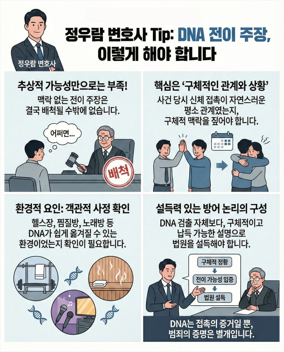 따라서 DNA 전이를 주장하려면, 먼저 사건 당시의 관계와 상황을 구체적으로 짚어야 합니다. 피해자와 피고인의 평소 관계상 신체 접촉이 자연스럽게 발생할 수 밖에 없는 맥락이 있었는지,