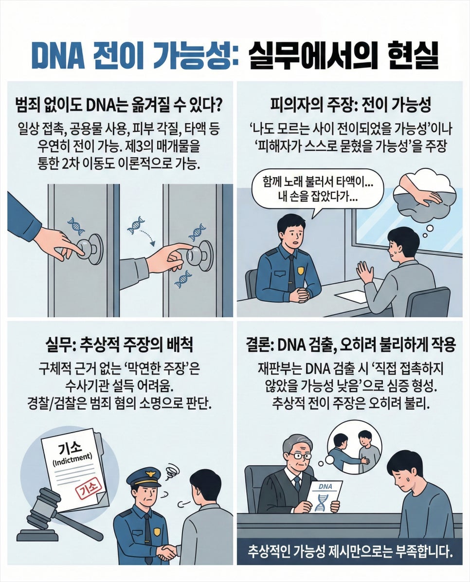 이와 같은 상황에서는 재판부는 '전이 가능성' 자체보다는, 오히려 DNA까지 검출된 이상 피고인이 직접 접촉하지 않았을 가능성은 낮다는 방향으로 심증을 형성하는 경우가 많습니다.