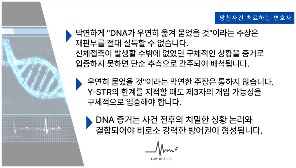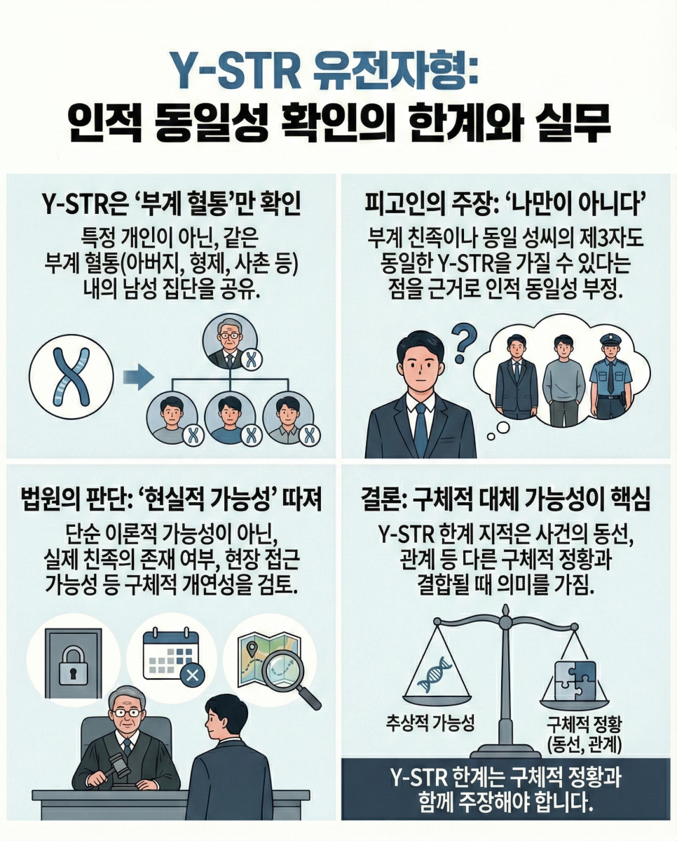 결국 Y-STR의 한계를 지적하는 방어는 그 자체로 완결된 논리가 되기 어렵고, 사건 당시의 동선-관계-현장 접근 가능성 등 다른 사정들과 결합될 때 비로소 의미를 갖는다는 점을 유의할 필요가 있습니다.