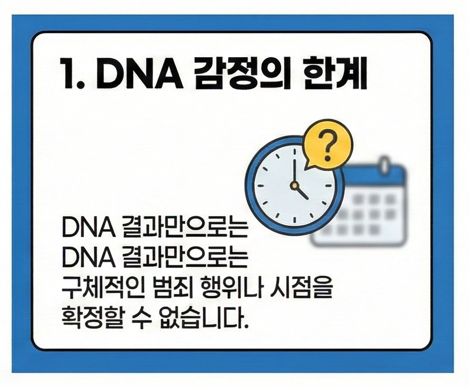 그러나 성폭력 사건에서는 DNA는 어디까지나 신체접촉이 있었을 가능성을 시사할 뿐, 그 접촉이 곧바로 범죄 구성요건에 해당하는 불법 행위였는지까지 직접 입증하는 증거는 아닙니다.
