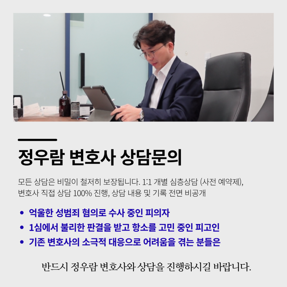 형사법전문 정우람 변호사는 고위 검찰 전관 변호사의 실무 경험을 통해 수사기관의 판단 흐름과 대응 방식을 누구보다 정확히 이해해 왔습니다.