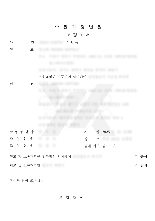 법무법인 YK의 조력으로, 상대방이 의뢰인에게 재산분할금으로 4,300만 원을 지급하는 조정이 성립되었습니다.