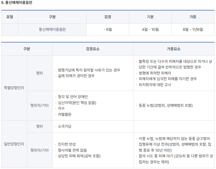 그 밖의 양형기준에 대하여는 양형위원회가 제공하는 통신매체이용음란 양형자료표를 참고하시길 바랍니다.