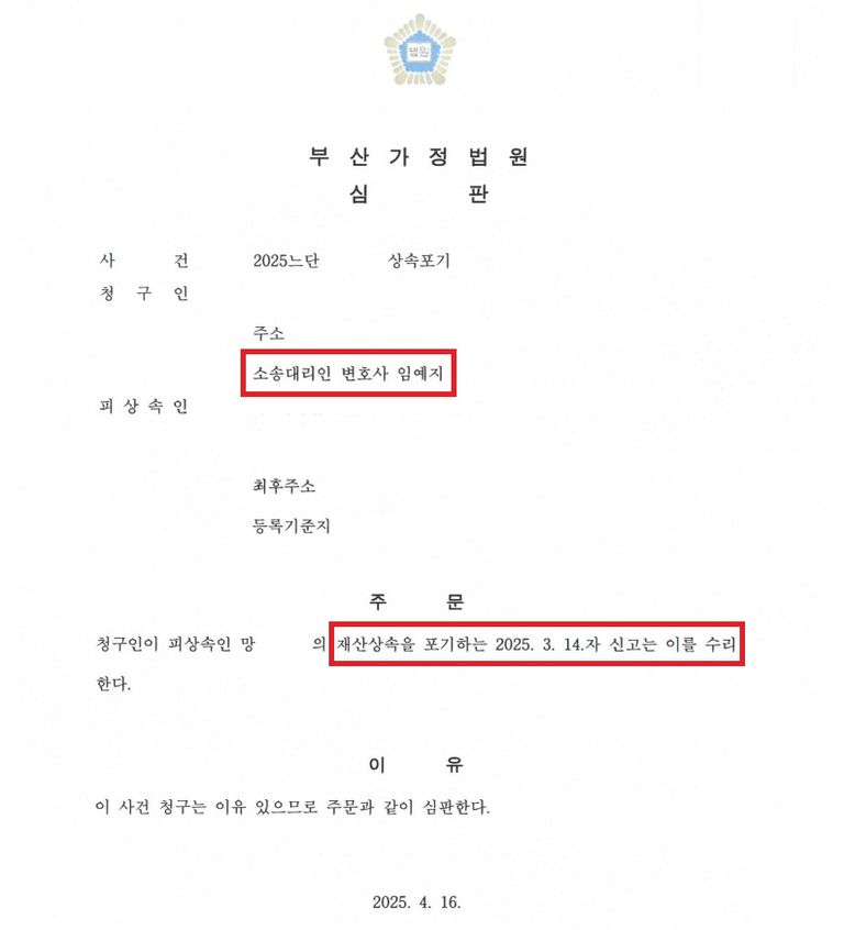 의뢰인은 시행착오 없이 빠르게 상속포기를 신고하여 수리 결정을 받기를 원하셨기에 저희 법률사무소 예우를 찾아오셔서 상속포기를 의뢰하셨습니다.