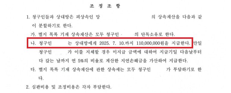 종전에 다른 상속인으로부터 제시받은 5,000만 원을 훨씬 넘는 금액인 1억 1,000만 원을 지급받기로 하는 상속재산분할 조정을 성공적으로 성립시킬 수 있었습니다.