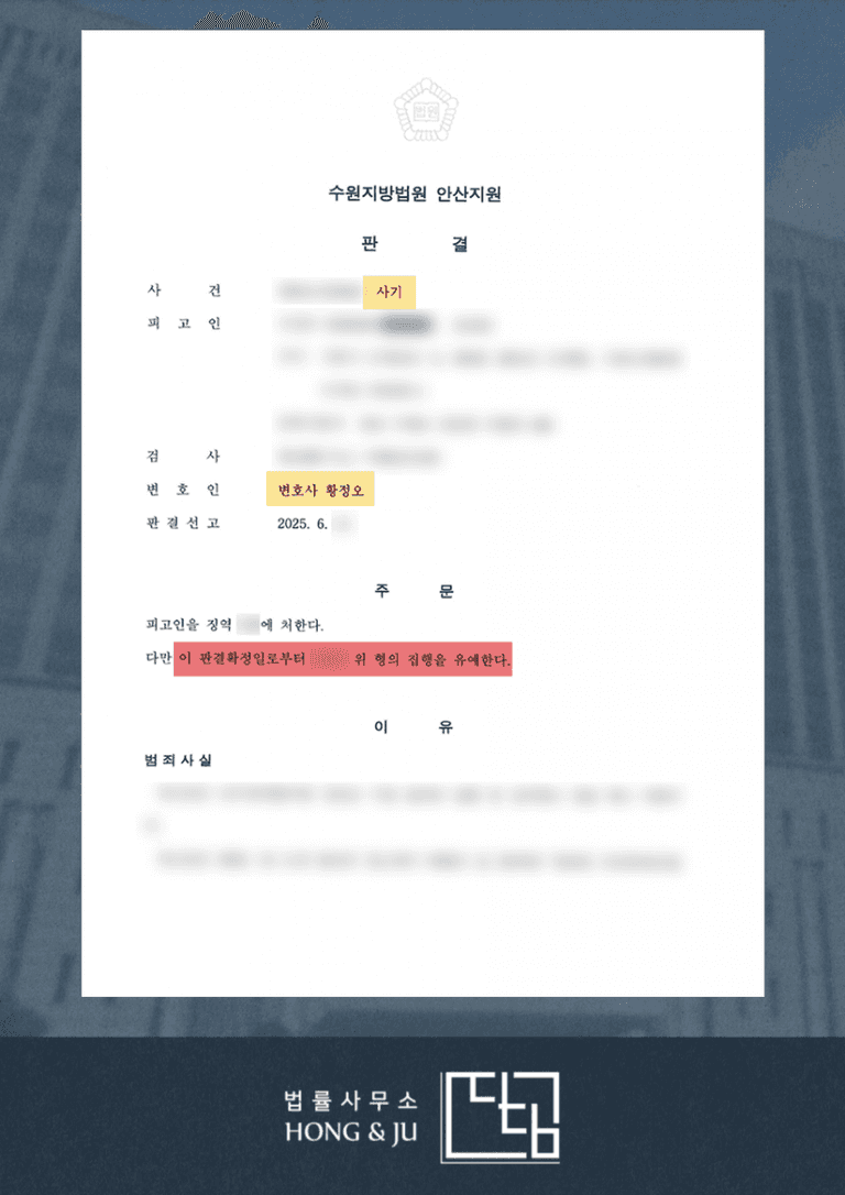 위와 같이 황정오 안산형사전문변호사 조력한 결과, 수원지방법원 안산지원은 변호인의 주장을 받아들여 집행유예를 선고했습니다.