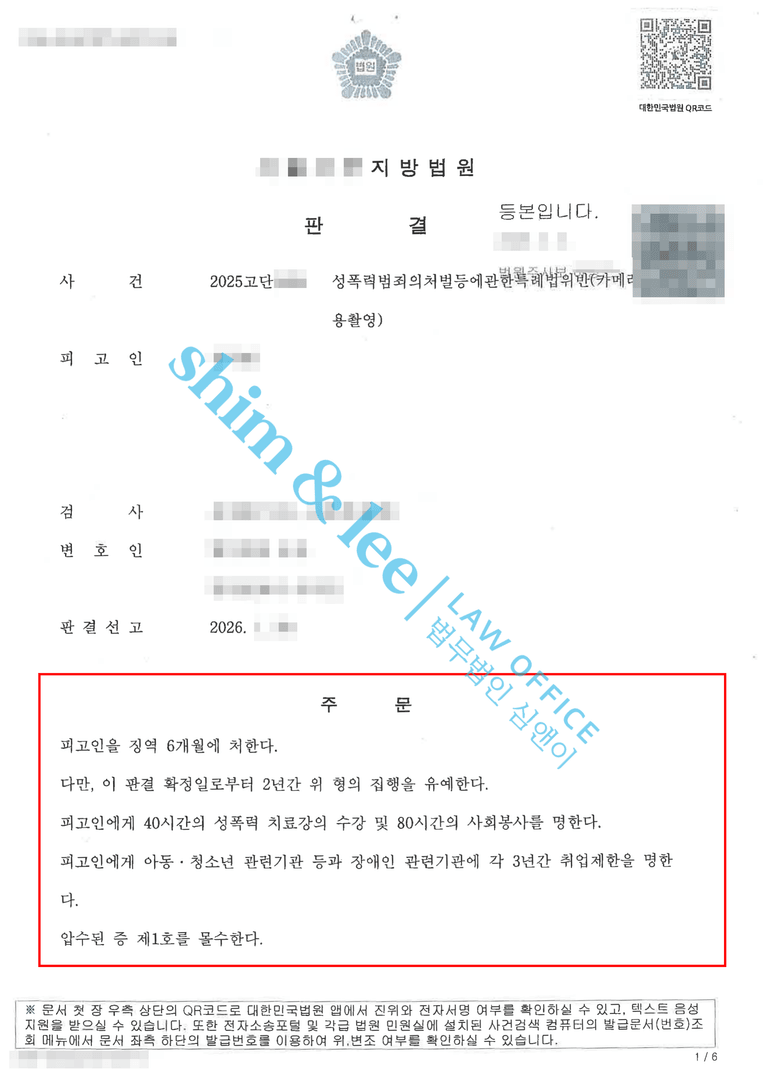 - 최종적으로 재판부는 가해자에게 징역 6개월, 집행유예 2년, 성폭력 치료강의 40시간, 사회봉사 80시간, 취업제한 3년을 선고했으며, 추가 피해를 예방하기 위한 조치로 범행에 사용된 가해자의 휴대폰을 몰수했습니다.