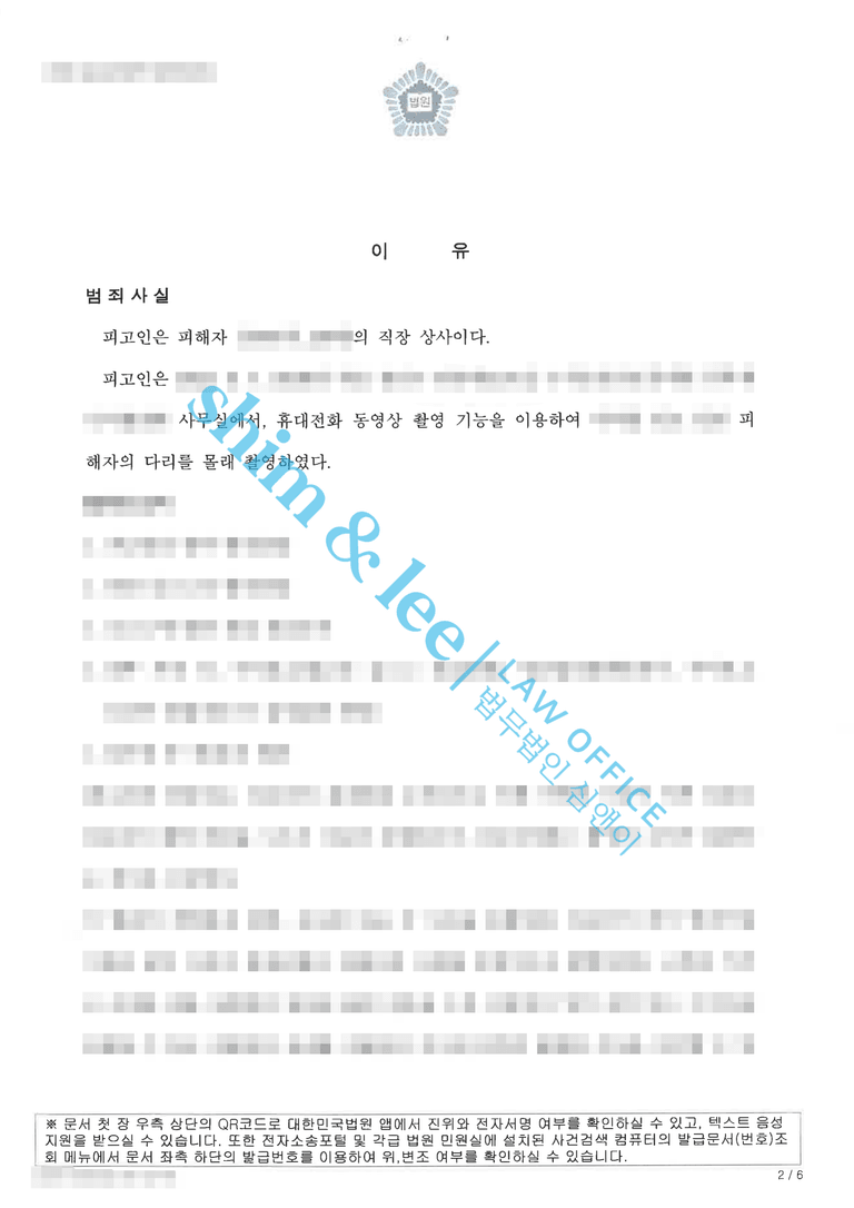 - 수상함을 느낀 A씨는 즉시 이 사실을 의뢰인에게 알렸고, 의뢰인은 곧바로 사내 방재실에 문의하여 해당 시간대의 CCTV를 확인하였습니다. 영상에는 가해자의 휴대폰 카메라가 자신의 다리 등 신체 부위를 향하고 있는 장면이 포착되어 있었지만, 화질이 좋지 않아 실제로 촬영이 이루어졌는지, 저장까지 되었는지는 명확히 확인할 수 없었습니다.
