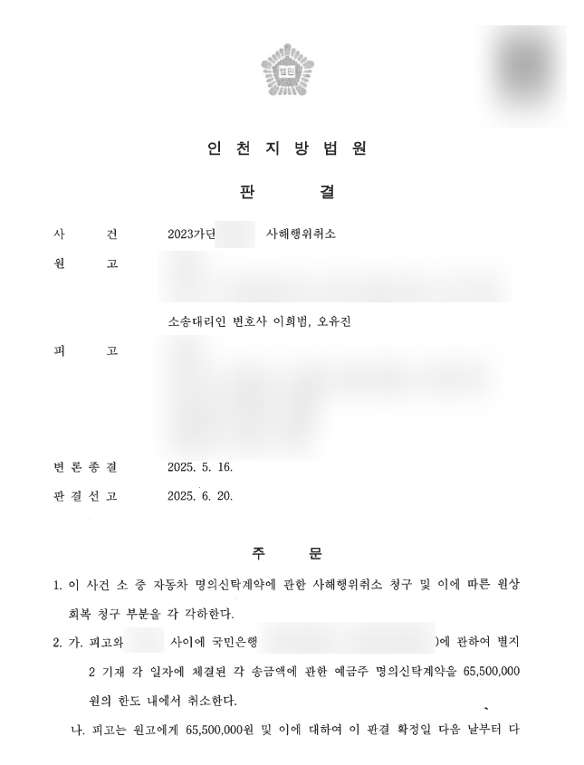 이후 저희 사무실에 위임해주셨고, 소송 전략을 정비하여 가액배상으로 청구 취지를 변경, 법원은 피고가 명의신탁 명목으로 인출한 65,500,000원을 사해행위로 인정, 피고는 원고에게 해당 금액 전액 및 지연손해금을 지급하라는 판결을 선고하였습니다. 반면, 자동차 명의이전 부분은 제척기간 도과로 각하되었으나, 실질적으로 소송의 핵심이었던 금전부분에 대해 전부 인용되어 의뢰인의 주된 소송 목적을 달성한 판결이었습니다.