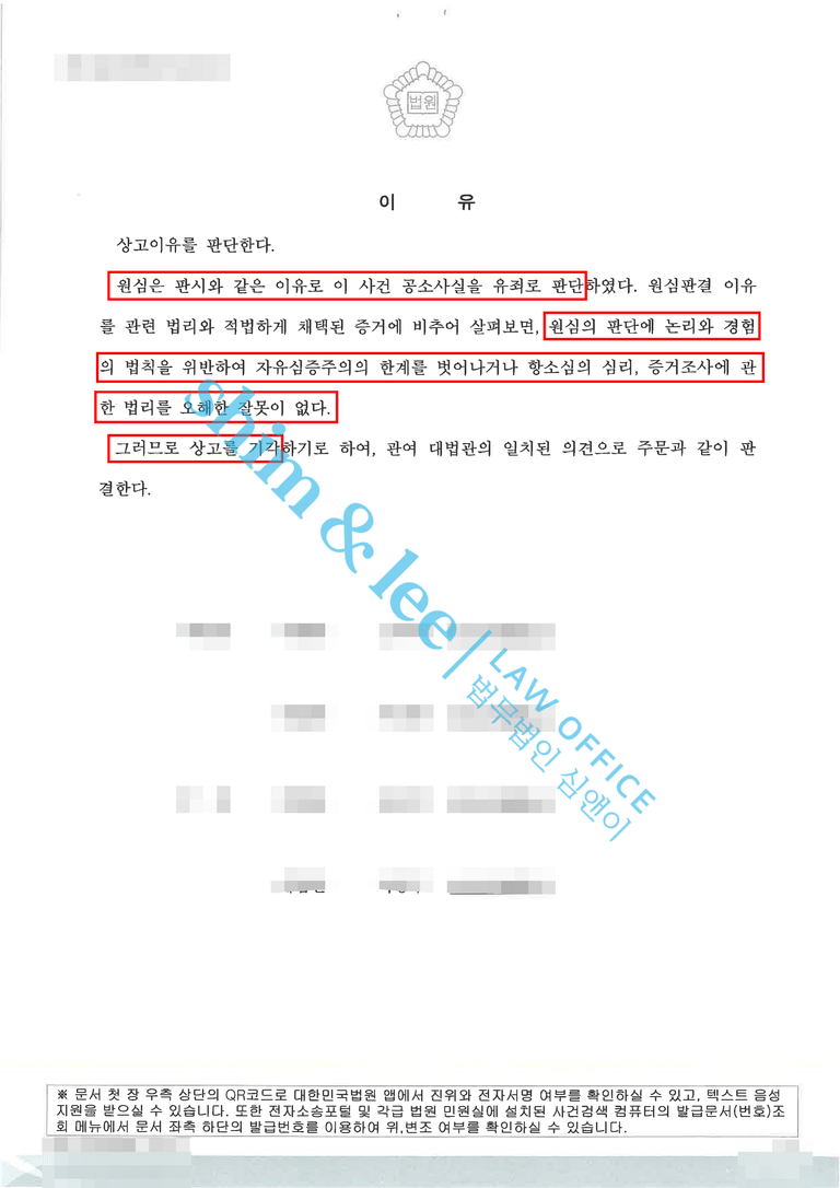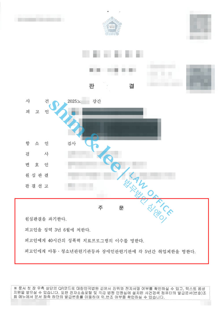 - 도저히 납득할 수 없는 판결에 억울함을 느낀 의뢰인은 항소심을 앞두고 심앤이를 찾아오셨고, 치열하게 다툰 끝에 항소심에서는 무죄를 유죄로 뒤집고, 가해자에게 징역 3년 6월, 성폭력 치료강의 40시간, 취업제한 5년이라는 엄중한 선고가 내려졌습니다.