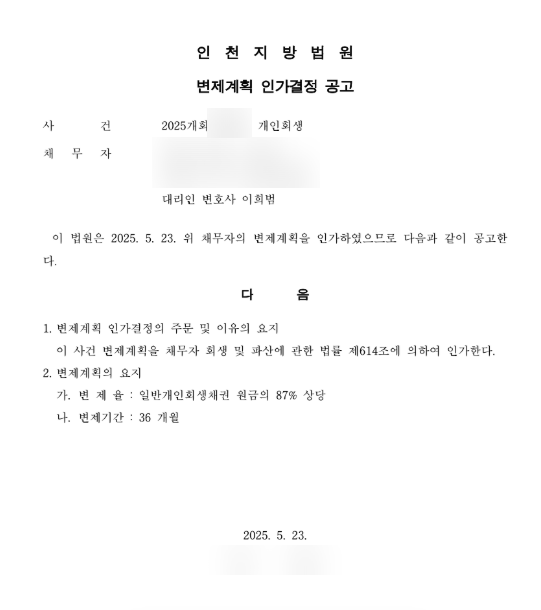 물론 채무 사용처 및 출금 내역 중 문제가 될 수 있는 부분과 대략적인 금액은 사전에 파악하고 있었던 만큼, 변제금이 과도하게 증가하지 않는 범위 내에서 사용처를 성실히 기재하고 관련 소명자료를 함께 제출하여 보정서를 제출하였습니다. 그 결과 약 2개월 만에 개시결정을, 약 3개월 만에 인가결정을 받을 수 있었습니다.