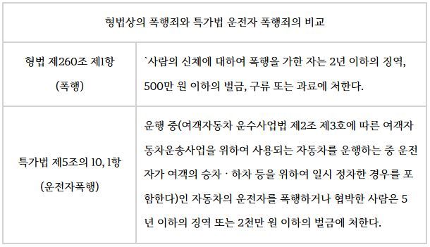 하지만 지난 2015년 자동차를 운행하는 중 운전자가 여객의 승하차를 위해 일시 정차한 경우를 포함한다라는 문구를 넣어 정차 중인 택시와 버스의 운전자를 폭행한 경우라도 운전자 폭행죄로 처벌하도록 하였습니다.