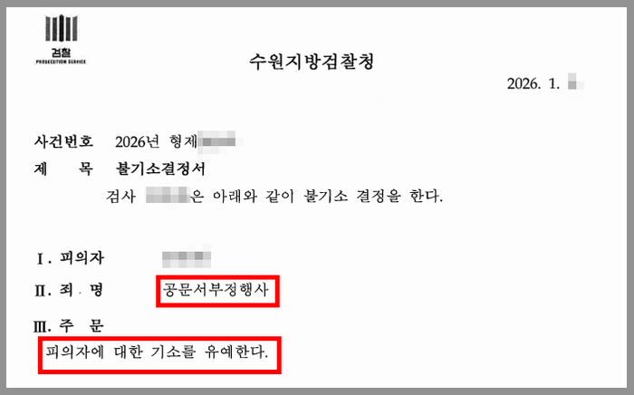 이 사건의 경우 J의 행위가 공문서부정행사죄에 해당하는 것은 명백하였기 때문에 검사의 기소유예 처분을 통해 범죄전력이 남지 않도록 하는 것을 목표로 사건을 진행했습니다.