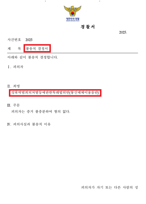 수사기관은 이러한 변론을 받아들였고, 해당 메시지가 통신매체이용음란죄의 구성요건에 해당한다고 보기 어렵다고 판단하여 의뢰인에 대해 불송치 결정을 내렸습니다.