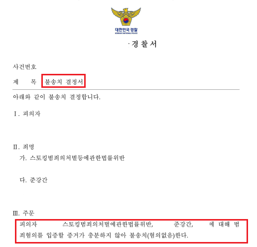 그 결과, 준강간 혐의와 스토킹처벌법 위반 혐의 모두에 대해 불송치 결정이 내려졌습니다.