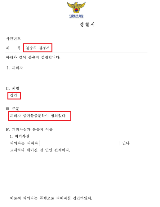 수사기관은 이러한 사정들을 종합적으로 검토한 끝에, 고소인의 진술만으로 강간 혐의를 인정하기 어렵고, 객관적 자료와의 모순이 크다는 점을 받아들였습니다.