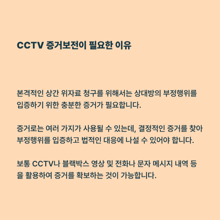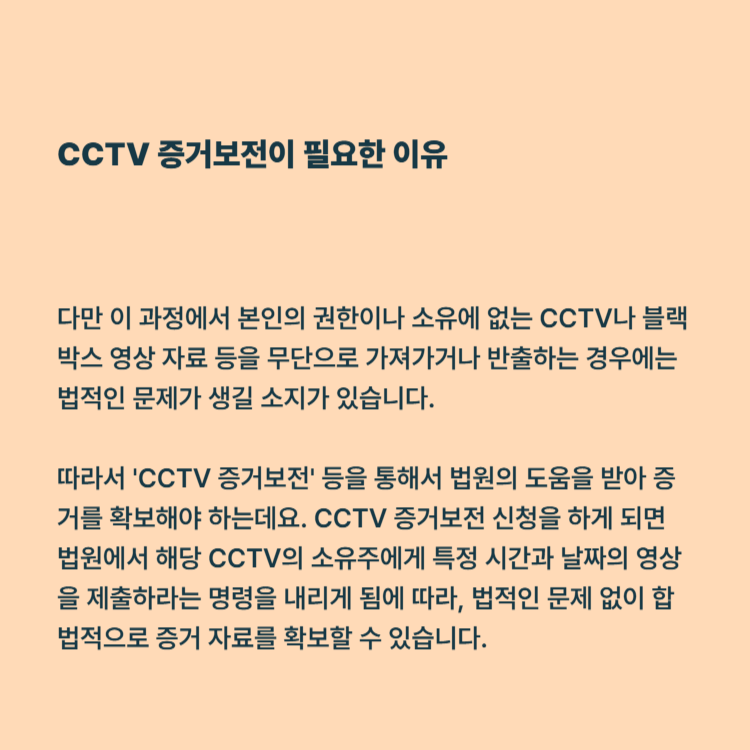 다만 이 과정에서 본인의 권한이나 소유에 없는 CCTV나 블랙박스 영상 자료 등을 무단으로 가져가거나 반출하는 경우에는 법적인 문제가 생길 소지가 있습니다. 따라서 'CCTV 증거보전' 등을 통해서 법원의 도움을 받아 증거를 확보해야 하는데요. CCTV 증거보전 신청을 하게 되면 법원에서 해당 CCTV의 소유주에게 특정 시간과 날짜의 영상을 제출하라는 명령을 내리게 됨에 따라, 법적인 문제 없이 합법적으로 증거 자료를 확보할 수 있습니다.