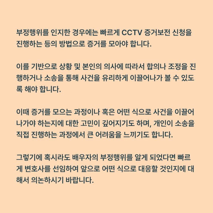 부정행위를 인지한 경우에는 빠르게 CCTV 증거보전 신청을 진행하는 등의 방법으로 증거를 모아야 합니다. 이를 기반으로 상황 및 본인의 의사에 따라서 합의나 조정을 진행하거나 소송을 통해 사건을 유리하게 이끌어나가 볼 수 있도록 해야 합니다.